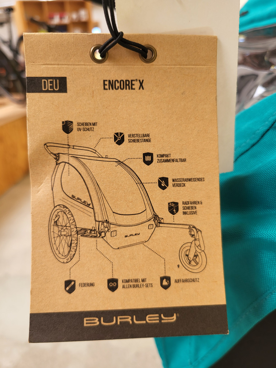 Sichern Sie sich einen neuwertigen Burley Encore X Kinderanhänger in der Farbe Türkis (Modell 2023/2024). Der Encore X ist ein vielseitiger Anhänger, der Sicherheit, Komfort und Flexibilität vereint und sich schnell in einen Kinderwagen umbauen lässt. Dieser Anhänger ist ideal für den Transport von zwei Kindern und befindet sich in einem makellosen Zustand (ggf. als Ausstellungs- oder Vorführmodell). Er ist sofort verfügbar. Fakten & Detaillierte Ausstattung Komfort & Sicherheit für die Kinder • Sitzplätze: 2 Kinder • Sicherheitsgurt: Gepolstertes 5-Punkte-Sicherheitsgurtsystem (einstellbar). • Federung: Dämpfende Federung für erhöhten Fahrkomfort auf unebenen Wegen. • Fenster: Rundum-Fensterscheiben mit hohem UV-Schutz und guter Belüftung. • Rückenlehne: Abclipbar, um den Innenraum für den reinen Lastentransport zu vergrößern. Technische Daten & Features • Zuladung (Max.): 45 kg • Eigengewicht: Sehr leichte 11,2 kg • Bremsen: Einfach per Fuß zu bedienende Feststellbremse (hält den Anhänger im Stand sicher). • Sichtbarkeit: LED-Rücklicht und Reflektoren für optimale Sichtbarkeit im Straßenverkehr. • Schiebebügel: Individuell einstellbarer Schiebebügel mit Sicherheitsfangleine (für den Kinderwagen-Modus). • Transport & Lagerung: Kompakt zusammenfaltbar für einfachen Transport im Auto oder platzsparende Lagerung. • Zulassung: Zugelassen nach StVZO (in der Fahrradanhänger-Konfiguration). Service und Besichtigung Der Anhänger ist bei uns im Laden zu besichtigen und abzuholen. Gerne zeigen wir Ihnen die einfache Handhabung, das Zusammenfalten und die schnelle Ankupplung an Ihr Fahrrad. Besondere Kaufvorteile: 1. Zufuhr-Service: Kostenlose Lieferung im Umkreis von 50 km. 2. Versand: Fachgerechte Verpackung und Abwicklung des Versands (Kosten nach Absprache). Nutzen Sie diese Gelegenheit, um sich diesen hochwertigen Burley-Anhänger zum attraktiven Preis zu sichern! Bei Fragen melden Sie sich gerne jederzeit. Öffnungszeiten & Kontakt Hinweis: Bitte prüfen Sie die aktuellen Zeiten auf unserer Webseite oder rufen Sie uns an. Montag Geschlossen Dienstag 09:00–12:00, 15:00–18:00 Uhr Mittwoch 09:00–12:00, 15:00–18:00 Uhr Donnerstag 09:00–12:00, 15:00–18:00 Uhr Freitag 09:00–12:00, 15:00–18:00 Uhr Samstag 09:00–14:00 Uhr Sonntag Geschlossen der Fahrradladen Langenau Hannes Michalek Wörthstraße 40 89129 Langenau 07345/2109500