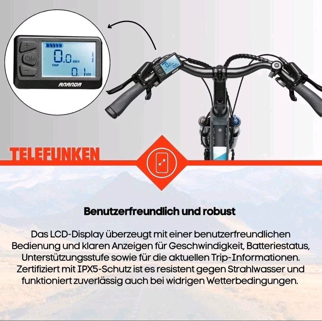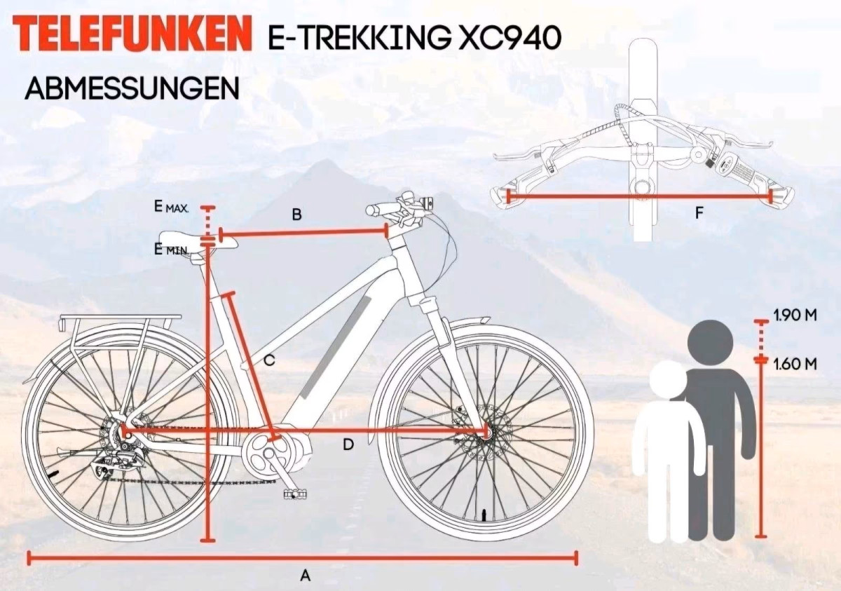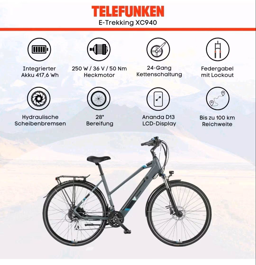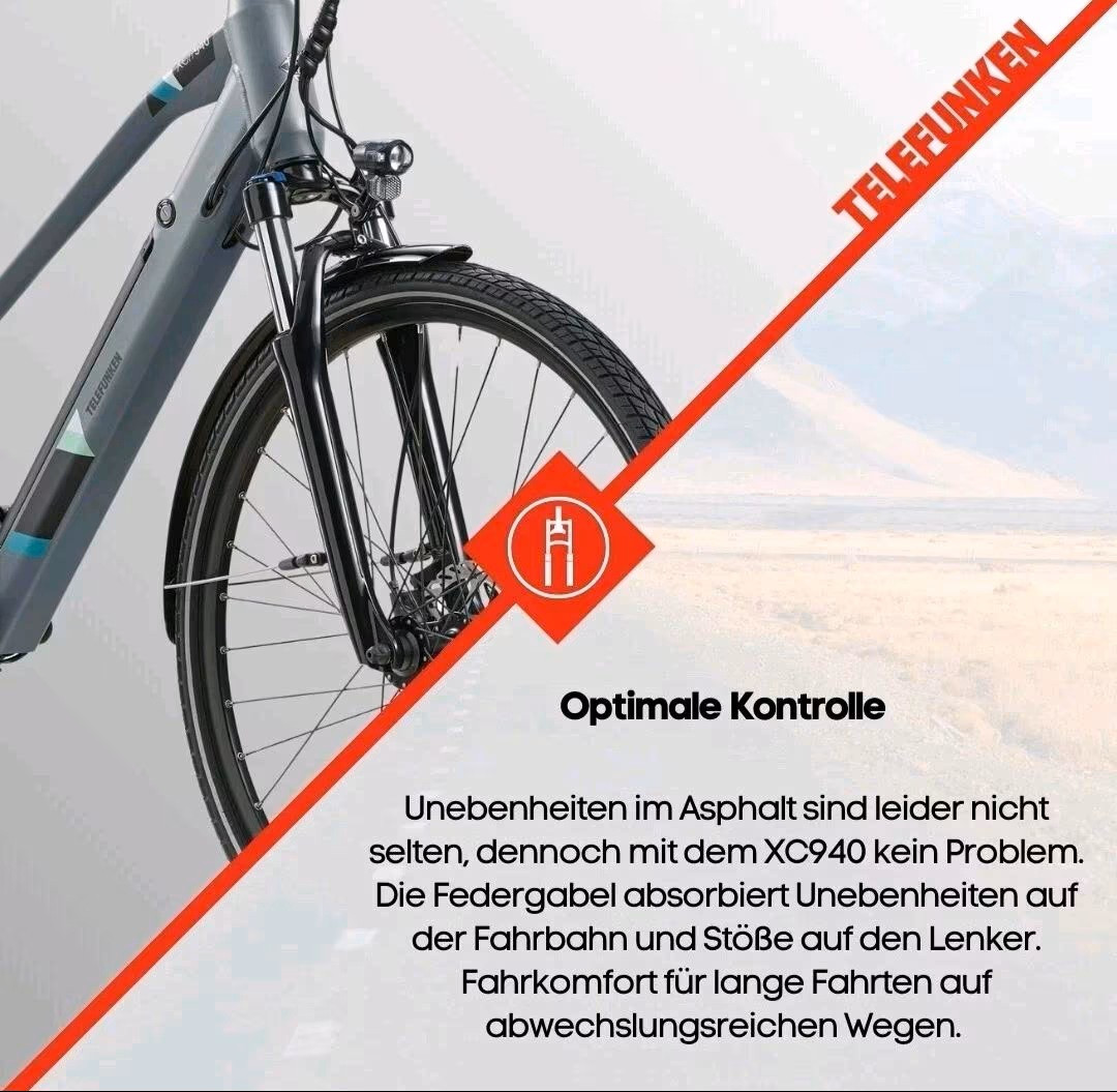 rleben Sie die Freiheit und Effizienz des Telefunken E-Bike Damen Trekking Pedelecs Expedition XC940, ideal für moderne Frauen, die Wert auf Komfort und Stil legen. Ausgestattet mit einem leistungsstarken Motor und einer robusten 28-Zoll-Bereifung, bietet dieses Pedelec mit 24 Gängen ein entspanntes Fahrerlebnis, ob auf urbanem Terrain oder leichten Trails. Die hochwertige Verarbeitung der Marke Telefunken garantiert Langlebigkeit und Zuverlässigkeit, wodurch Sie Ihre Abenteuer ohne technische Sorgen genießen können. Biete hier mein Ebike zum Verkauf an wegen Neuanschaffung. Das Fahhrad ist 2 Jahre alt, kaum gefahren und in einem sehr guten Zustand. Versand ist Möglich, entsprechende Verpackung dafür ist vorhanden. Versandkosten trägt der Käufer! Garanite-Anspruch: Nein Da Verkauf von Privat! Versand erfolgt nach Vorkasse und Eingangsbestätigung auf meinem Konto! Telefunken 28 Zoll Trekking E-Bike Expedition XC940 FLEXIBILITÄT: Das Pedelec E-Bike mit 28 Zoll Reifen ist dank Aluminum-Rahmen sehr leicht - mit der 24-Gang Shimano Acera Kettenschaltung ist das Trekkingbike alltagstauglich REICHWEITE: Die Kombination aus integriertem Ananda Hinterradmotor mit 250 Watt und hochwertigem, itegriertem Akku sorgt bei bis zu 25 km/h für Tretunterstützung mit einer Reichweite von bis zu 100 km; 11,6 Ah / 36V Lithium-Ionen-Akku FEATURES: Kurze Akku-Ladezeit, LCD-Display (verstellbar) und LED-Scheinwerfer (15 Lux) + LED Gepäckträgerrücklicht, Seitenständer, Anfahr- & Schiebehilfe KOMFORT: Das Elektrofahrrad für Damen wird zu 98 Prozent montiert angeliefert - der Trekking Sattel mit Komfort-Dämpfung und der Trekking-Fahrradlenker machen das Rad mit Elektroantrieb komfortabel SICHERHEIT: Das Ebike ist nicht zulassungspflichtig und bietet die vollständige Ausstattung nach StVZO (LED-Beleuchtung und Reflexbereifung) - Hydraulische Scheibenbremsen vorne und hinten sorgen für Sicherheit Das Pedelec Trekking Fahrrad mit Elektroantrieb der Qualitätsmarke Telefunken ist für alle geeignet, die sich bequeme Mobilität in Form eines Elektro-Fahrrads wünschen. Ein Trekkingrad bietet den perfekten Kompromiss zwischen dem sportlichen Design eines Mountainbikes und der alltagstauglichen Vollausstattung von City-Modellen. Dadurch eröffnen sich vielseitige Nutzungsmöglichkeiten, egal ob täglicher Weg zur Arbeit, einem gemütlichen Wochenendausflug oder einer mehrtägigen Fahrrad-Reise. Das E-Bike kommt in der komfortablen, Damen-typischen Form mit tiefem Einstieg, ist aber ausdrücklich für jeden geeignet (Unisex). Der leistungsstarke Akku ermöglicht eine Reichweite von bis zu 100 km. Die umfängliche LED Beleuchtung und hydraulischen Promax Scheibenbremsen vorne und hinten sorgen für Sicherheit. Zum schnellen Start wird das Ebike zu 98% vormontiert geliefert. Die Reichweite eines Pedelecs ist u. a. maßgeblich von folgenden Faktoren abhängig: gewählte Unterstützungsstufe Beladung des Bikes (Gewicht des Fahrers/der Fahrerin zzgl. Gepäck) Geländeprofil (Ebenen/Steigungen/Gefälle) gewählter Gang Untergrund (Asphalt, Feldweg, Schotterstrecke, Waldboden, matschiger Untergrund) E-Bike-Typ und Bereifung Reifendruck Ladezustand des Akkus Außentemperatur Windverhältnisse Trittfrequenz Die persönliche Reichweite ergibt sich aus dem Mix der oben angeführten Punkte und hat eine sehr große Spannbreite zwischen ca. 25% - 150% des angegebenen Reichweitenwertes. Die besten Reichweitenwerte erreichen Sie bei mittlerer Unterstützungsstufe, möglichst niedrigem Gang bei hoher Trittfrequenz Gewicht der Zuladung inkl. Gepäck bei 75 Kilogramm, maximal zulässiger Reifendruck, ebener Strecke, 20 °C Außentemperatur, Windstille, asphaltiertem Untergrund und voll geladenem Akku. Nicht zu verwechseln ist ein Pedelec mit einem benzin- oder elektrisch angetriebenen Fahrzeug. Die Reichweite des Pedelecs addiert sich aus der menschlichen und elektrischen Leistung.