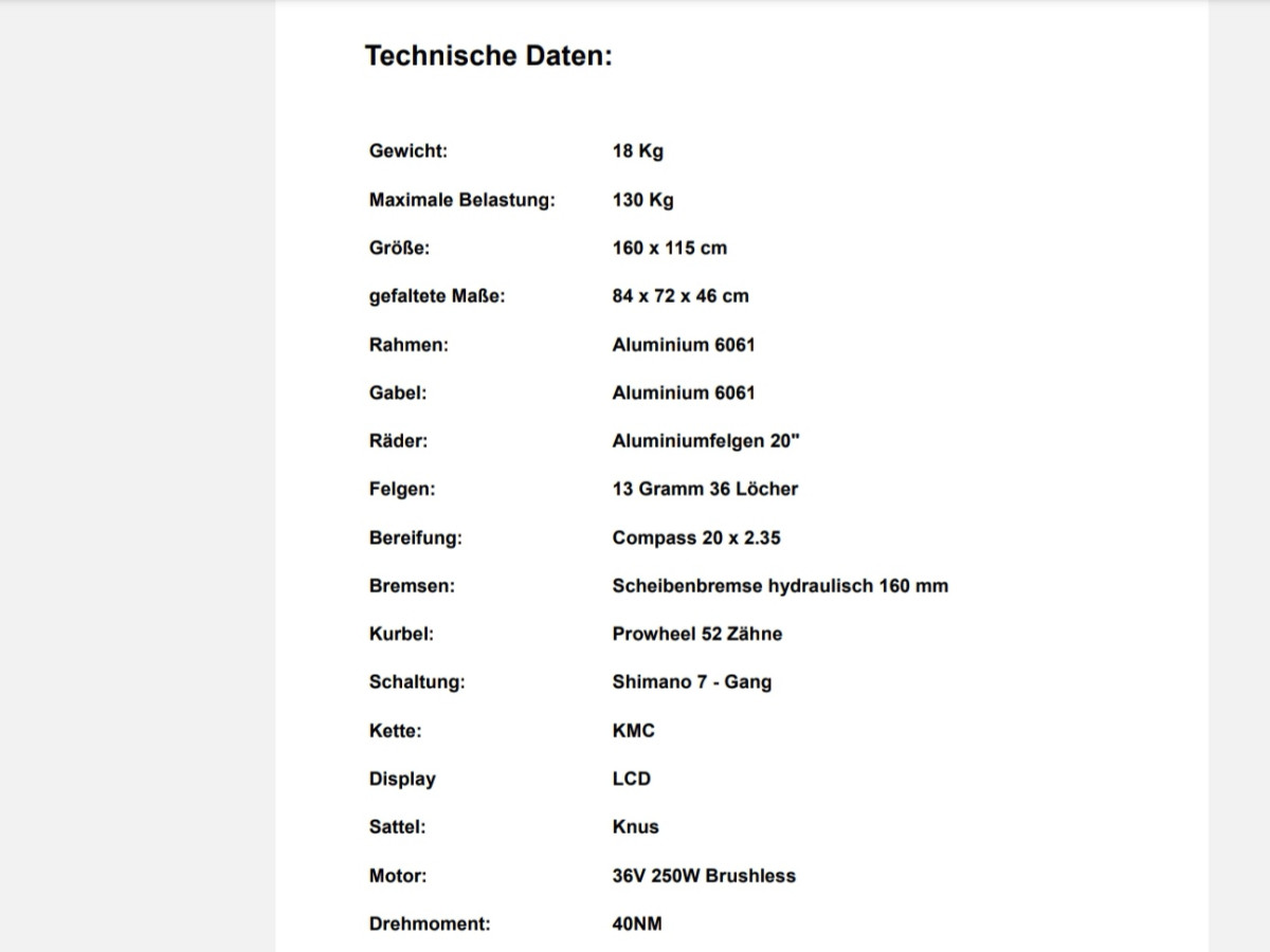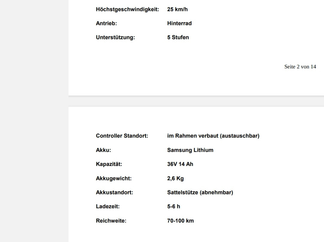 20 Zoll e-Faltrad von 2021, hat eine Laufleistung von 3396km und wurde immer gut gepflegt und im Haus aufbewahrt. Keine Unfälle oder Stürze. Die letzte Inspektion wurde im November 2025 gemacht. -20 Zoll Laufräder -Rahmenhöhe 28cm -7-Gang-Schaltung -Bafang Motor 36V 250W brushless, 40Nm -504Wh Samsung Lithium 36V 14Ah Akku mit Schloss -mit Faltschloss und Rahmenhalterung -Transporttasche
