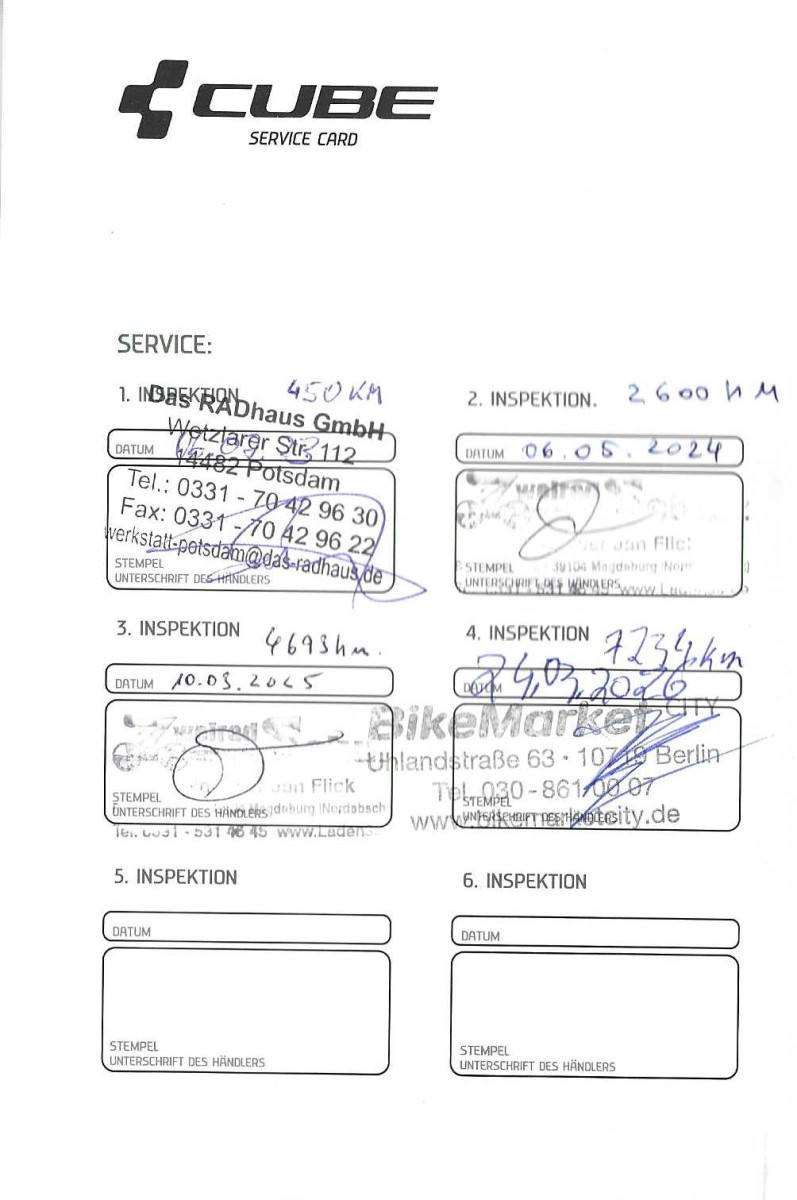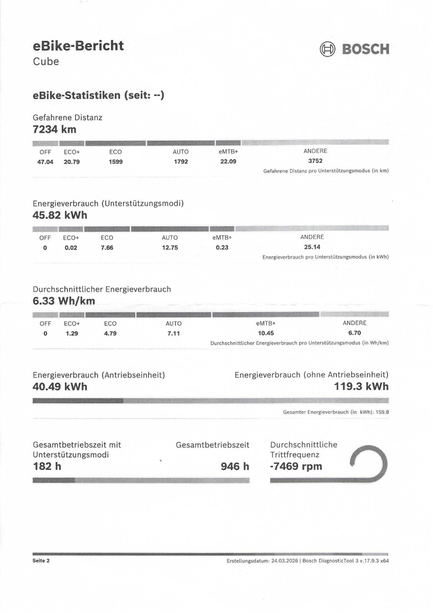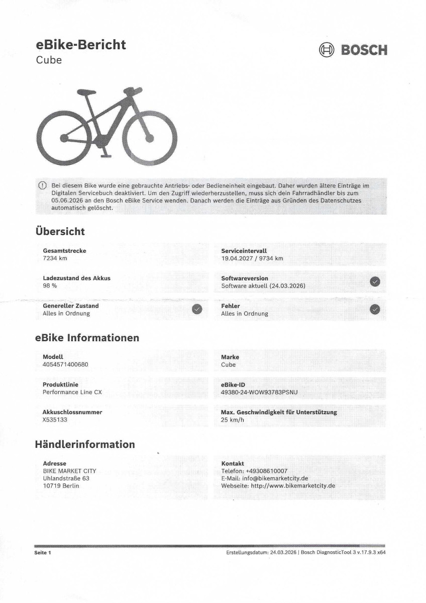CUBE Stereo Hybrid 120 SLX Allroad 750 29-20- Fully E-MTB Bosch CX 85Nm, 750Wh Scheckheftgeflegt: Alle Inspektion u. Service von einer Fachwerkstatt durchgeführt. Baujahr / Kaufdatum. 17.05.2023 Gesamtlaufleistung: 7234 km Neupreis mit Umbau: 5341,45 € eBike Bericht vom 24.03.2026 vorhanden u. neue Update Ladezustand Akku 98 % Rahmengröße: L ( 175 - 185 ) cm Sattelstift: Cube Dropperpost zur Bedienung vom Lenkrad aus Top Zustand mit Sonderumbau: Vorbau: Performance E-MBT 90mm Cube Lenker: Riser Bar 30-31 Ergotec. Griffe: 702 Medium SQlab. Innenbands: 410-402 SQlab. Pedale: MBT Reifen: Schwalbe Johnny Watts 26x2.60 / 65-622 Kette:Shim. Kette CN M 6100 Kassette: Decore CS-M6100 12fach neue bei 4569 km Privatverkauf Kommen Sie nach Magdeburg an der schönen Elbe u. machen Sie eine Probefahrt u. dann gleich mitnehmen. Hersteller Cube ANZAHL GÄNGE 12 Bremse Shimano BR-MT520, Hydr. Disc Brake (203/203) BREMSENTYP Scheibe (hydraulisch) Gabel Fox 34 Float AWL, 2-Position Sweep-Adjust RAIL Damper, Tapered, 15x110mm, E-Bike Optimized, 120mm GABEL Federgabel Rahmen Aluminum Superlite, Gravity Casting Technology, Efficient Comfort Control, FSP 4-Link, Agile Comfort Geometry, Boost 148, Fully Integrated Battery, Advanced Internal Cable Routing RAHMENFORM Diamant RAHMENMATERIAL Aluminium RÜCKTRITT Nein SCHALTUNG Kettenschaltung SCHALTWERK Shimano XT RD-M8100-SGS, ShadowPlus, 12-Speed MARKEN Cube AKKULEISTUNG 750Wh Display Kiox 300 Smart MOTOR Bosch Drive Unit Performance CX Generation 4 (85Nm) Cruise (250Watt), Smart System Dämpfer Fox Float DPS EVOL, 185x55mm (27.5: 165x45mm),
