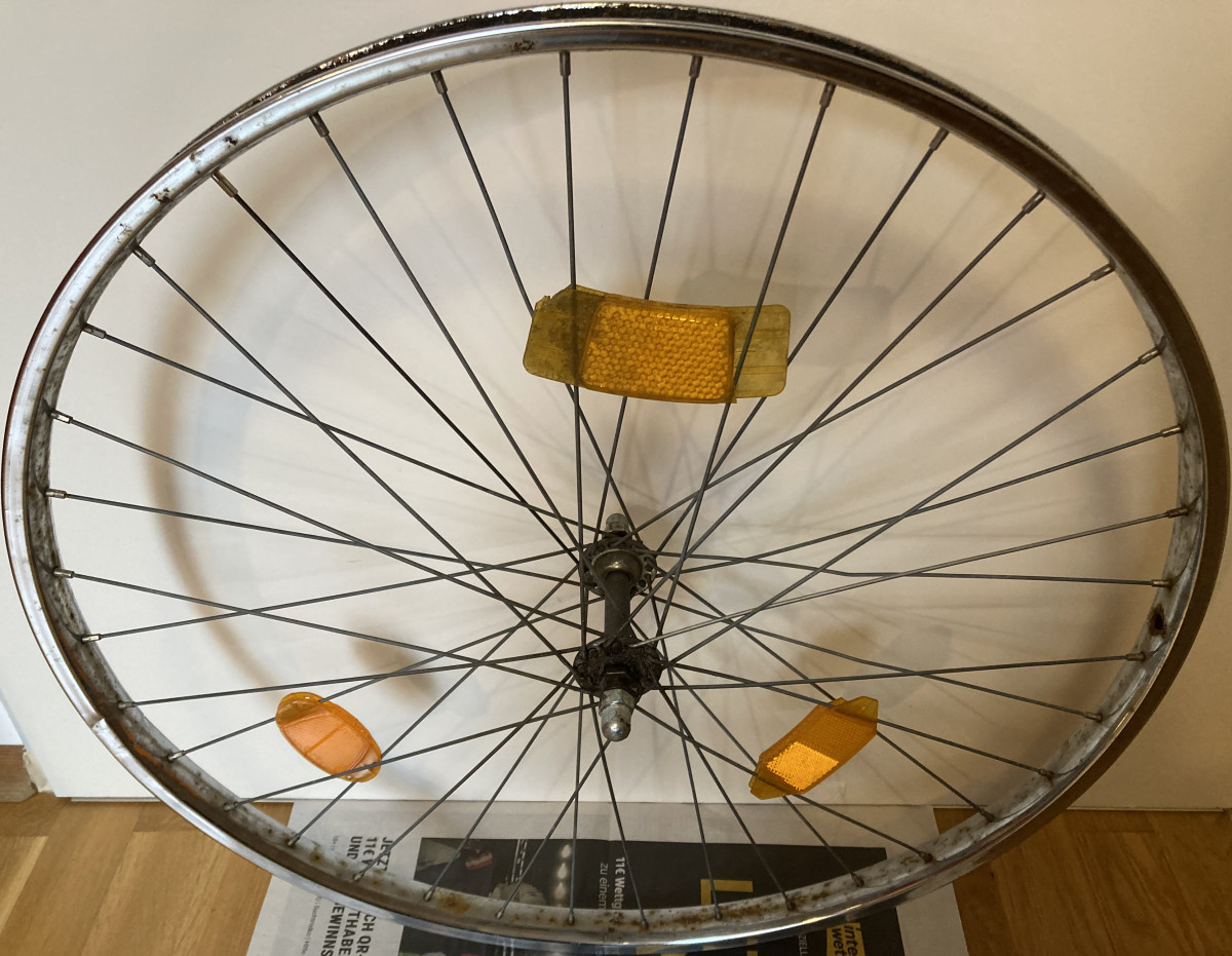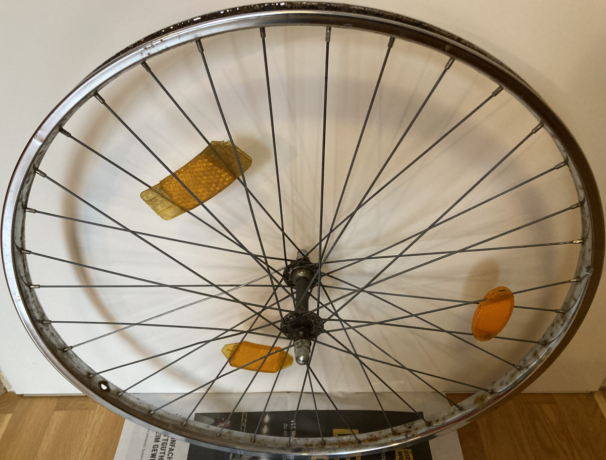 Marke: Van Schothorst. Für nominelle Reifengröße: 26 Zoll. Material: Stahl. Anzahl der Speichen: 36. Anzahl der Reflektoren: 3. Breite: 14,065 cm. Farbe: glänzend stählern. Durchmesser: 57,5 cm. Außenmaulweite der Felge: 2,87 cm. Einbaubreite ohne Scheiben: 9,18 cm. Innenmaulweite der Felge: 2 cm. Gewicht: 1201 g. Einbaubreite mit Scheiben: 9,53 cm. Bremsmethode: Felgenbremse. ETRTO-Maß: 20×559. Herstellungsland: Niederlande. Die Außenmuttern an der Nabe wurden nach der Abnahme des Rades vom Fahrrad zugedreht, um die Abmessungen für Lagerung und Transport zu verkleinern. Die Gesamtbreite von knapp über 14 cm wurde nach der Zudrehung gemessen. Vor der Installation sollte man die Außenmuttern aufdrehen und die inneren Muttern ganz leicht aufdrehen, sodass das Rad an der Achse frei rotieren kann, aber nicht so weit aufdrehen, dass das Rad an der Achse wackelt. Bevor ihr den Achter zu begradigen beginnt, nutzt ein geeignetes Lösungsmittel, um die Speichennippel bezüglich der Speichen zu lockern, und haltet neue Ersatzspeichen mit Nippeln sicherheitshalber parat. Die Reflektoren sind teilweise zerbrochen. Die Felge ist außen leicht rostig. Das Felgenbett ist stark verrostet. Die Felge hat eine Beule (vom Reifenabnehmen mit Schraubenzieher) und einen Achter. Mindestens zwei Originalspeichen mit ihren Speichennippeln sind gegen neuere ausgetauscht. Prinzipiell sollte der Achter begradigbar oder teilweise begradigbar sein, nur habe ich für die Zentrierung keine Zeit mehr.