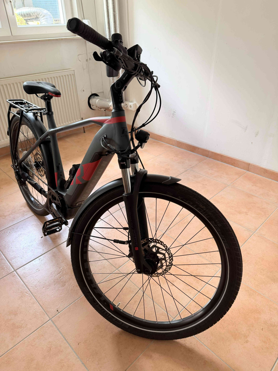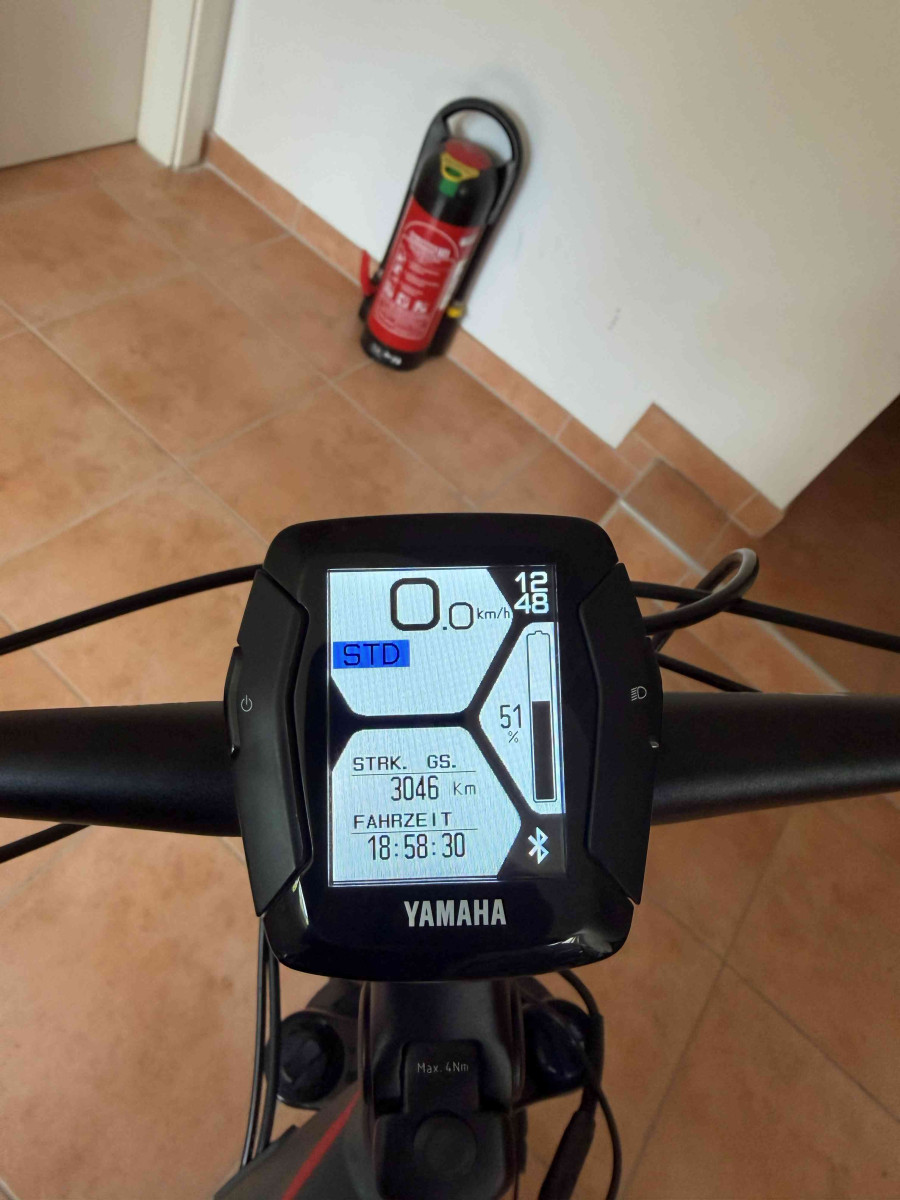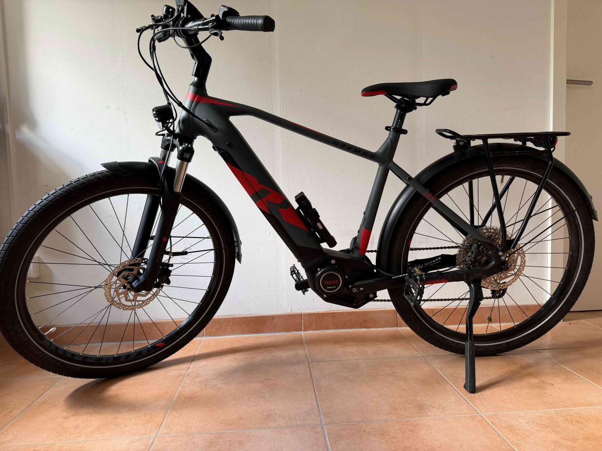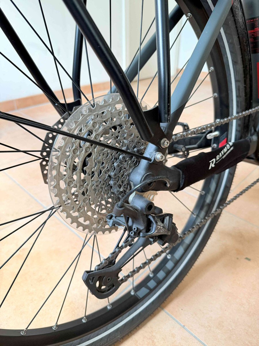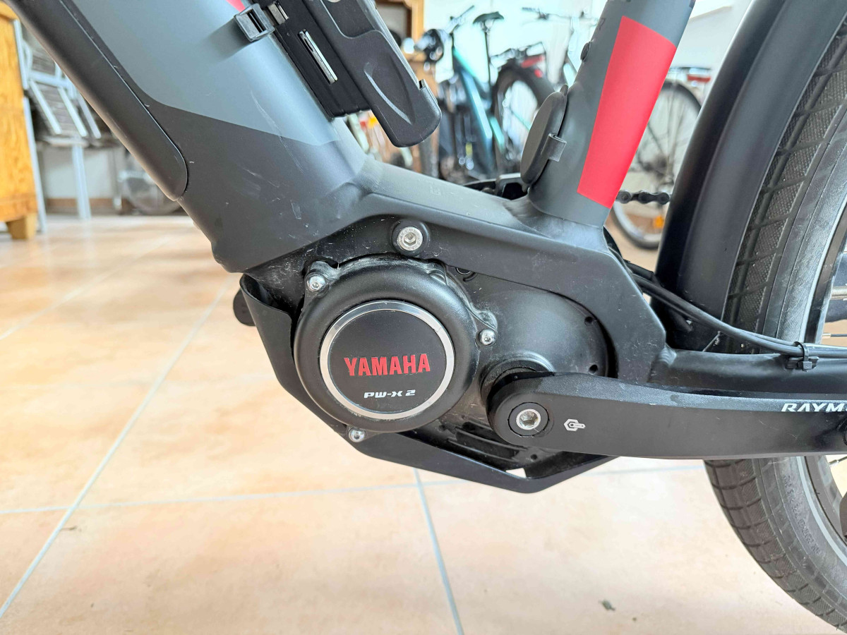 Das R Raymon TourRay E 8.0 aus dem Modelljahr 2021 ist ein hochwertiges Trekking-E-Bike (E-Trekking), das für Touren und den Alltag konzipiert ist. Es zeichnet sich durch einen starken Yamaha-Motor und einen großen Akku aus. Technische Daten: Motor: Yamaha PW-X2, 250 W, 80 Nm Drehmoment (Tretlagermotor) Akku: Simplo EnergyTube, 630 Wh, 36 V, 17,5 Ah (integrierter Rahmenakku) Display: Yamaha Display C Rahmen: Aluminium 6061, 27,5" Laufräder Schaltung: Shimano Deore XT, RD-M8100, 12-Gang (Kettenschaltung) Bremsen: Shimano BR-MT400, hydraulische Scheibenbremse, 4 Kolben Reifen: Schwalbe Super Moto-X (Straßenprofil) Beleuchtung: Litemove HKSE-70 (70 Lux) vorne, AXA Blueline E hinten Gewicht: Ca. 25,4 kg bis 27,2 kg (abhängig von Ausstattung und Rahmengröße) Zulässiges Gesamtgewicht: 130 kg Rahmengröße: M Besonderheiten: Das TourRay E 8.0 bietet durch den 80 Nm starken Yamaha PW-X2 Motor eine hohe Kraftentfaltung. Es ist für lange Touren ausgelegt und ist mit breiten Reifen für Komfort ausgestattet. Der Motor verfügt über verschiedene Unterstützungsmodi, darunter einen automatischen Modus, der sich an die Trittfrequenz anpasst. Achtung: Nur Abholung, kein Versand!