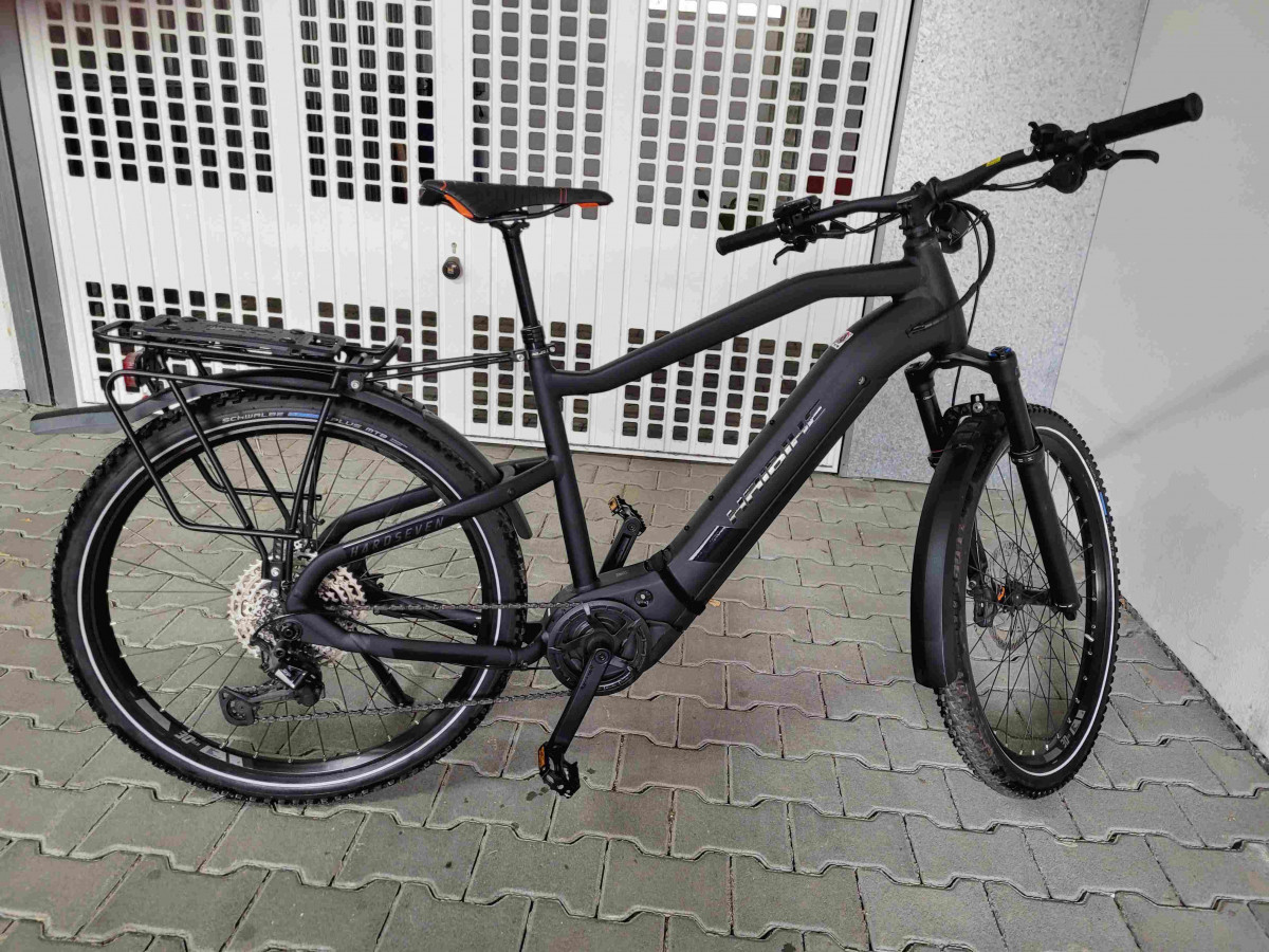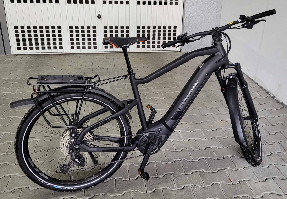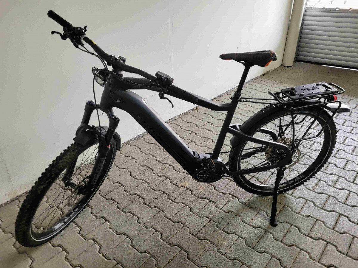 Neuwertiges E-MTB Haibike Hardseven 8 Modell 2021. Rahmengröße L keine Kratzer, technisch und optisch optimal in Schuß. Komplett mit Licht, Schutzblechen und Gepäckträger. 3 Komplettsätze Bremsbeläge sind auch noch mit dabei. Das Rad wurde am 8.6.2021 gekauft, Neupreis war 3.720,-- Euro. Es hat also noch 14 Monate Restgarantie. Nur Abholung. Spezifikation: Rahmen: Aluminium 6061, Steckachse X-12 (1.00) x 148mm Gabel: RockShox Revelation RC, Air, Travel: 120mm Schaltwerk: Shimano Deore XT M8100 Shadow Plus, 12-fach Schalthebel: Shimano Deore M6100 Zahnkranz: Shimano HG6100, 10-51 Zähne Kette: Shimano CN-M6100 Kettenblatt: Stahl, 38 Zähne Bremshebel: Shimano M6100, Aluminium Bremse vorne: Shimano M6100, Aluminium, 203 mm, 4-Kolben Bremse hinten: Shimano M6100, Aluminium, 180 mm, 4-Kolben Felgen: Rodi Tryp 30, Aluminium, 27, 5 Zoll Vorderradnabe: Shimano MT400-B Hinterradnabe: Shimano MT410 Speichen: Sapim Leader, black Lenker: XLC Topflat 740mm Vorbau: XLC Alu, A-Head Steuersatz: A-Head verjüngt Sattel: XLC MTB Sattelstütze: Dropper-Post Remote 31.6, Teleskop, 31.6 mm, Aluminium Motor: Yamaha PW-ST System, 250W, 70Nm, 25km/h Display: Yamaha Side Switch Akku: InTube 630Wh Ladegerät: Schnellladegerät 4A Zul. Gesamtgewicht: 120kg Rad-Typ: MTB Hardtail
