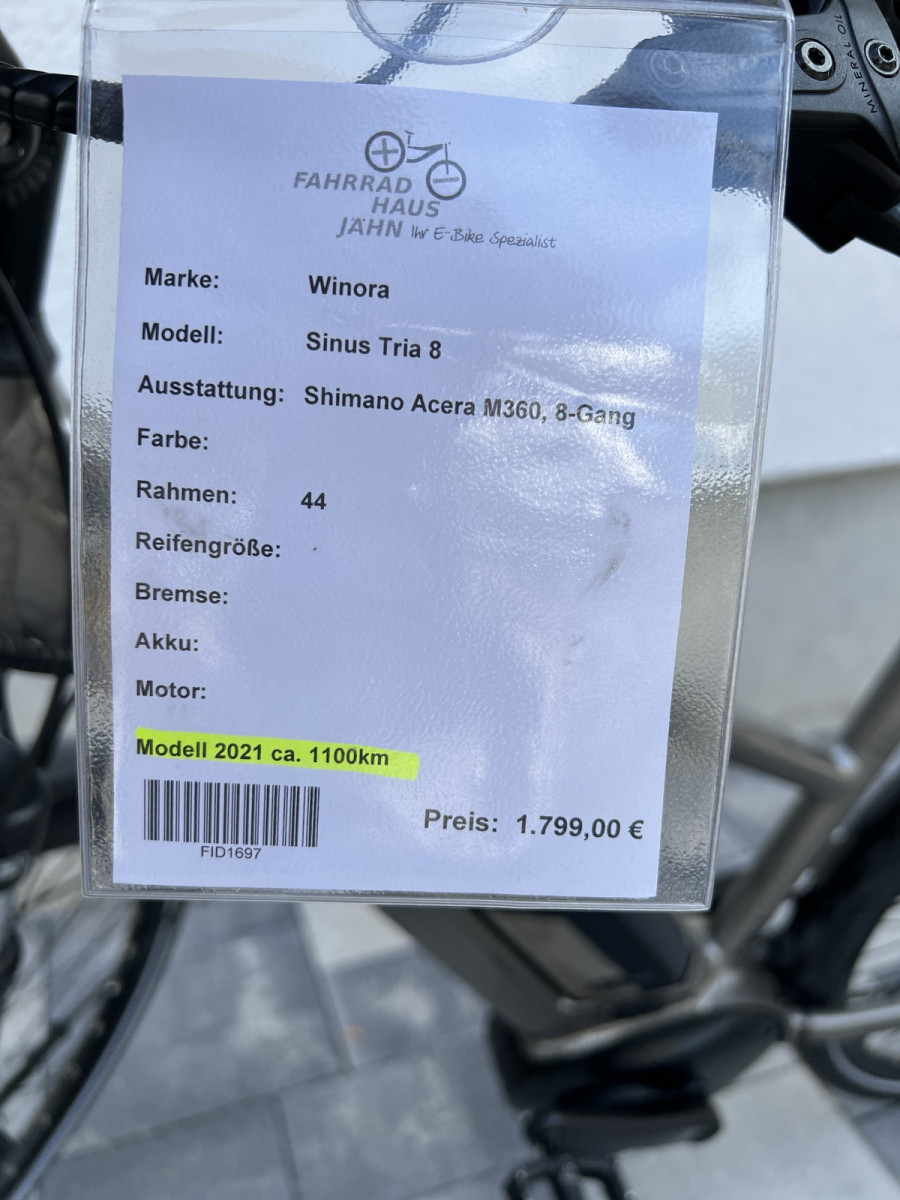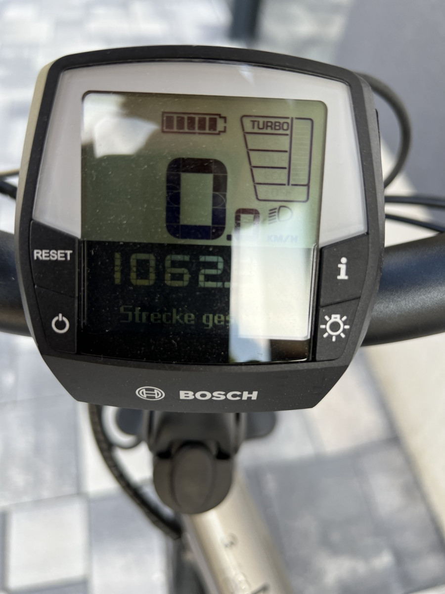 Rahmenhöhe 44 cm 1062 km Inspektion neu MOTOR Bosch, Active Plus, 250 W, 50 Nm, 25 km/h DISPLAY Bosch, Intuvia AKKU Bosch, PowerPack, 400 Wh RAHMENFAMILIE Winora, Aluminium 6061, hydroformed, THT, Bosch Interface, Aluminium 6061 GABEL SR Suntour, NEX E25, Stahlfeder, Federweg= 50 mm, Aluminium steerer tube 1 1/8" - 1 1/2" tapered KURBELARM Winora, geschmiedet, Aluminium BREMSE (VORNE) Tektro, T275, 180 mm, 2-Kolben Scheibenbremse BREMSE (HINTEN) Tektro, T275, 160 mm, 2-Kolben Scheibenbremse SCHLAUCH Dunlop Ventil FELGEN Ryde, Zac421, Hohlkammer, Aluminium KLEMMSCHELLE Quick release, 34.9 mm SCHALTWERK Shimano, Acera M360 SCHALTHEBEL Shimano, Altus M310, Rapidfire, 8 Gänge INNENLAGER Im Motor integriert KETTENSCHUTZ Horn, Catena 18F KASSETTE SunRace, CSM55, 11 - 34 Zähnezahl KETTE KMC, X8 KETTENBLATT Lasco, Aluminium, 38 Zähnezahl BREMSHEBEL Tektro, T275, Aluminium BREMSSCHEIBE (VORNE) Tektro, TR180 BREMSSCHEIBE (HINTEN) Tektro, TR160 REIFEN Schwalbe, Road Cruiser , 42-622, 28" x 1.60" VORDERRADNABE Haibike Components, Aluminium nabe HINTERRADNABE Aluminium nabe SPEICHEN Sapim, Leader, Schwarz LENKER Ergobar, oversize, 640 mm GRIFFE XLC, Comfort bo3 VORBAU Aluminium, winkelverstellbar, Bar bore: 31.8 mm STEUERSATZ Feimin, A-Head Tapered, ball bearing SATTEL Selle Bassano, Volare City XL SATTELSTÜTZE Aluminium, Patent gefedert, 31.6 mm PEDALE VP, E461, Aluminium, mit Reflector SCHEINWERFER Busch & Müller, Upp, 30 lm RÜCKLICHT AXA, Blueline DYNAMO Über Systembatterie GEPÄCKTRÄGER Racktime, RT-336, 25.0 kg SCHUTZBLECHE RPZ, Evo, Chromoplastics FAHRRADSTÄNDER Ursus, Mooi, Hinterbauständer SCHLOSS AXA, Solid Plus GEWICHT (KG) 23.6 kg ZUL. GESAMTGEWICHT (KG) 130.0 kg